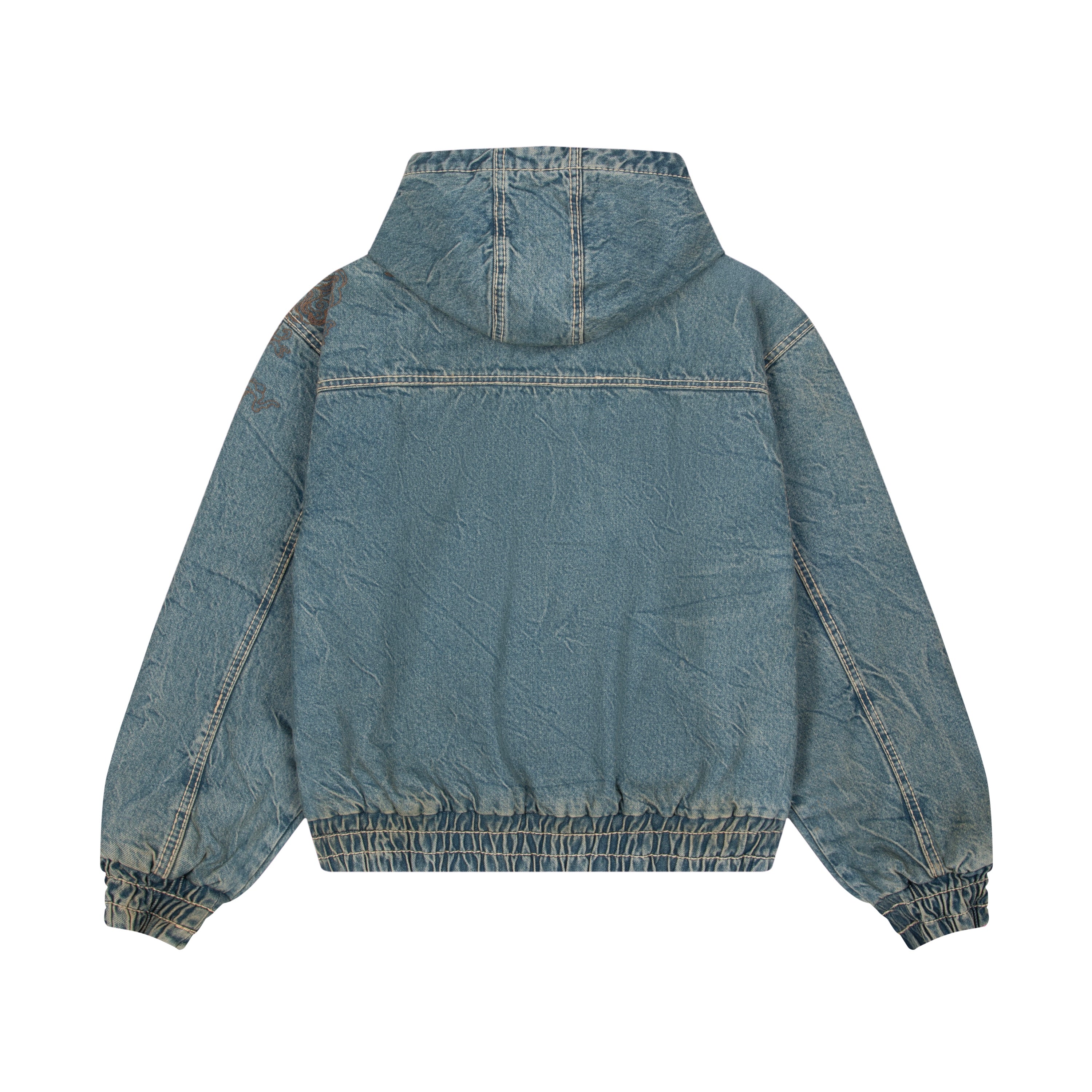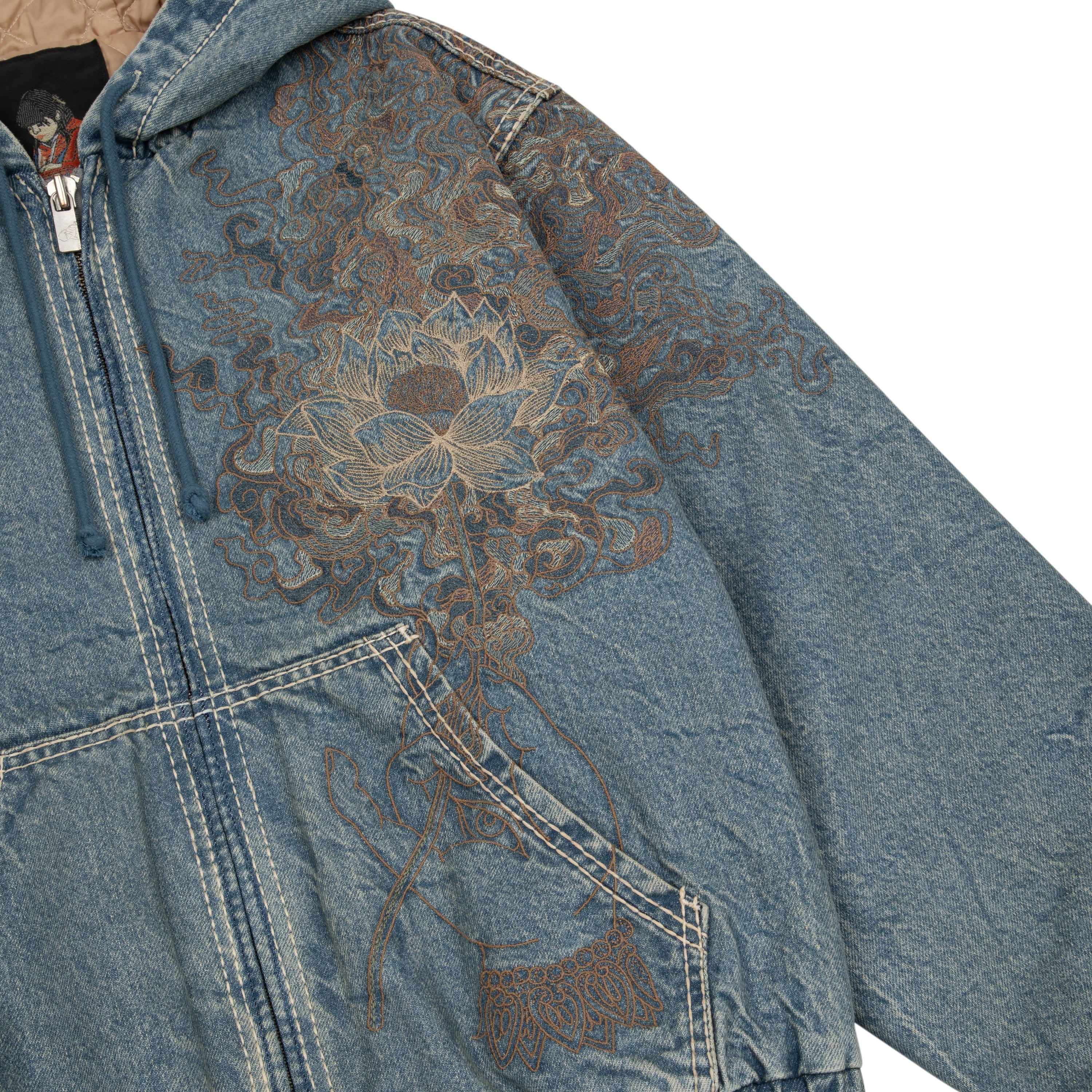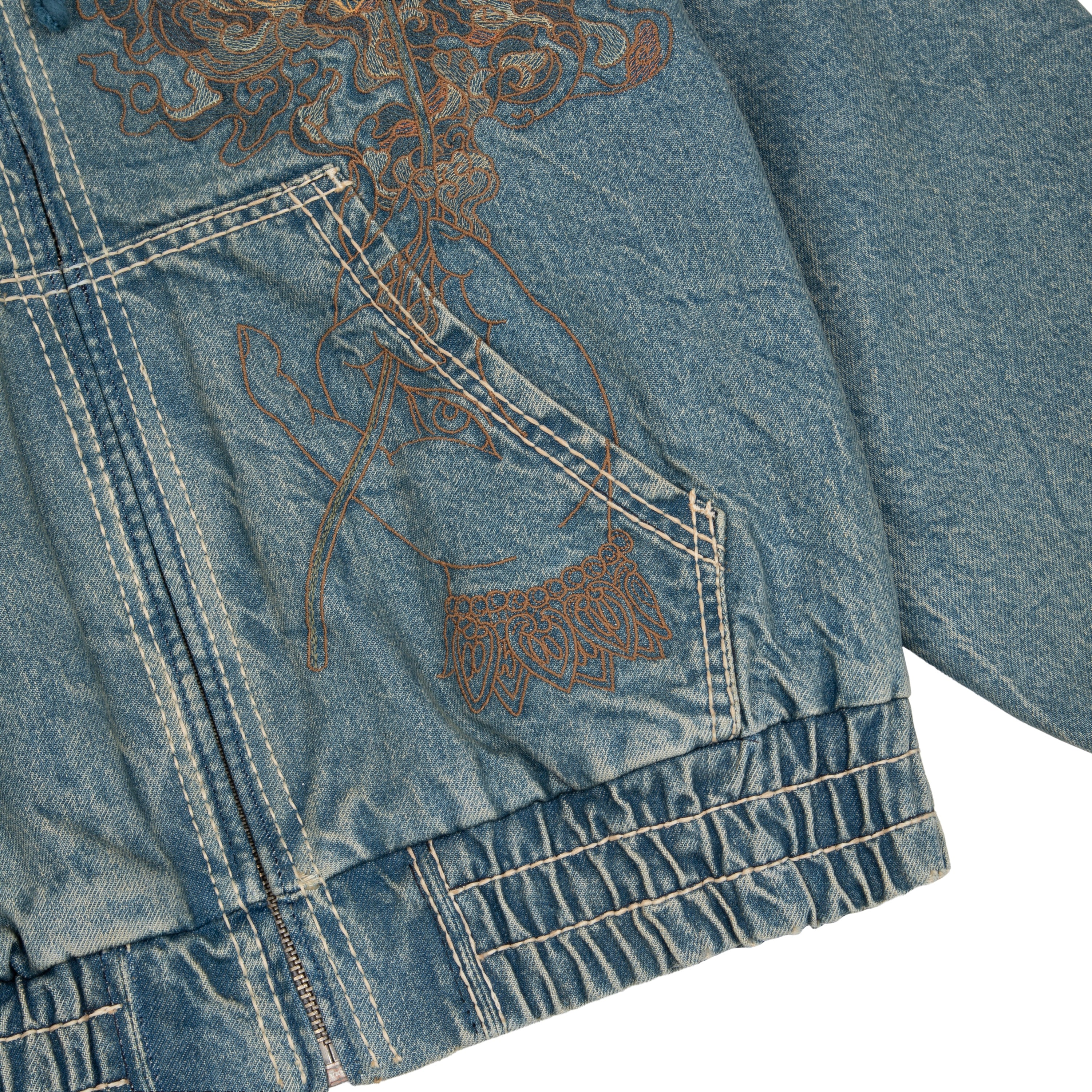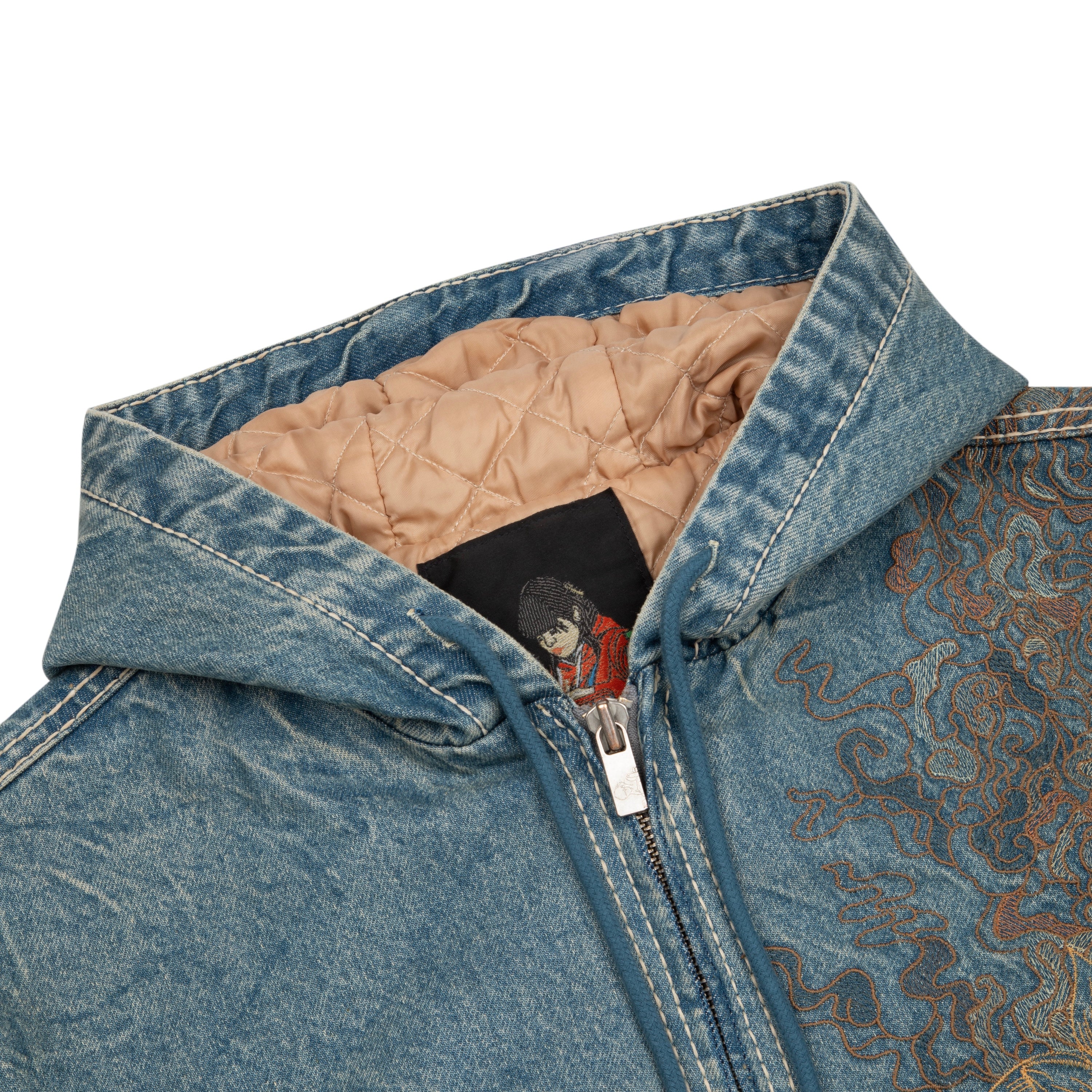 14,5oz fade washed denim / 100% cotton / quilted polyester lining / embroidery on front and back / with YKK zipper / fits true to size